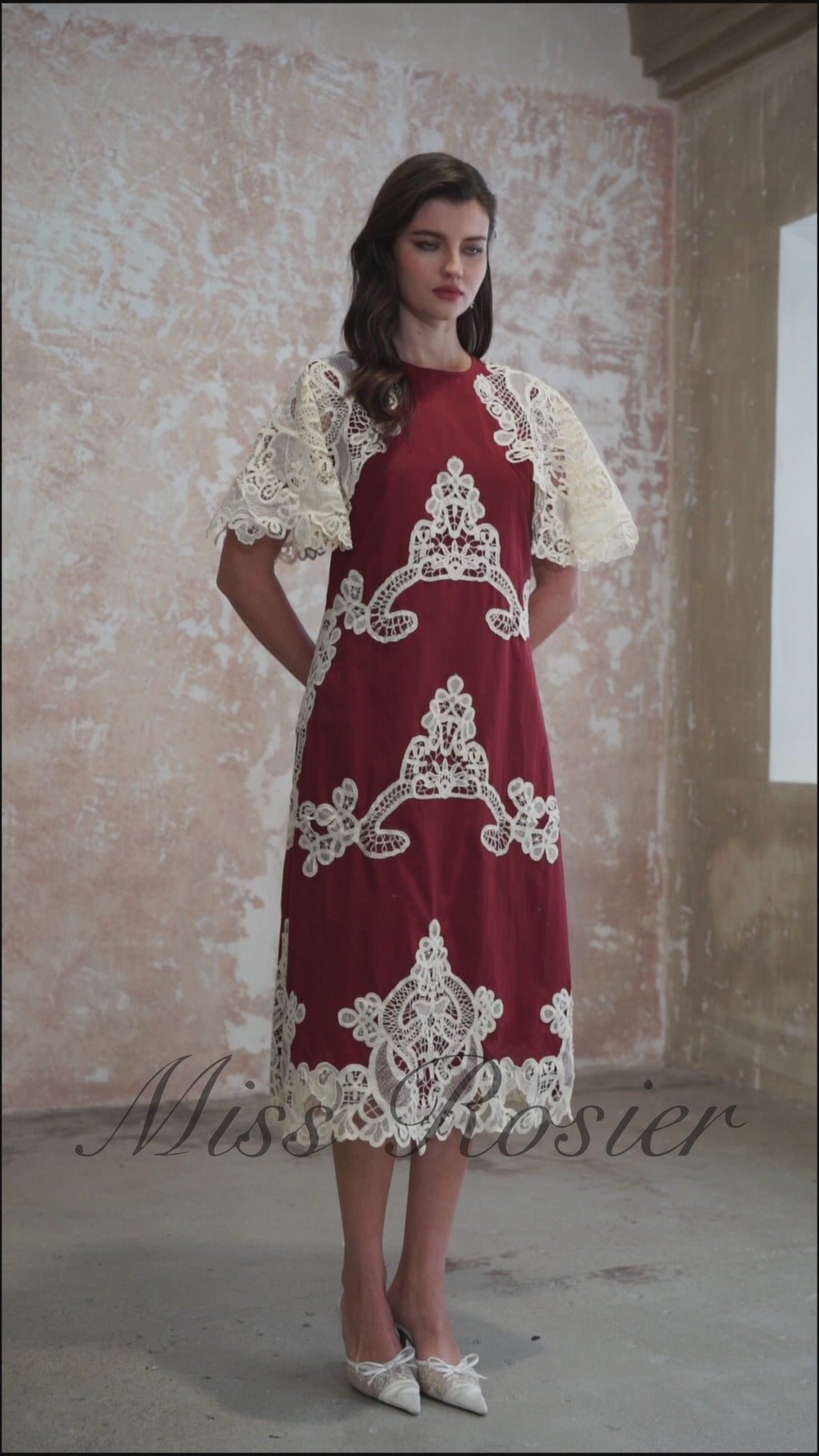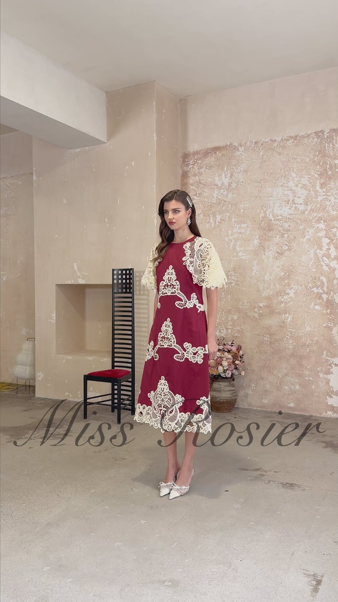 فستان ميدي مطرز بأزهار باللون الأحمر من جوليا