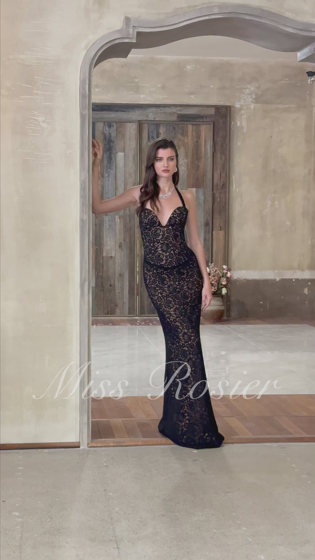 فستان طويل كورسيه من الدانتيل الأسود المزين بالزهور من صوفيا